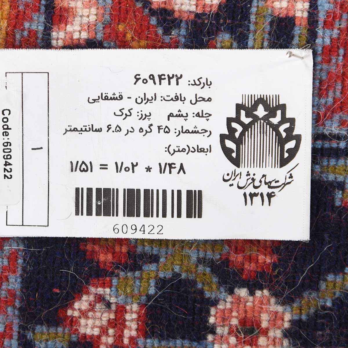 فرش دستباف شیراز 35 رج قواره ذرع و نیم کد: 609422