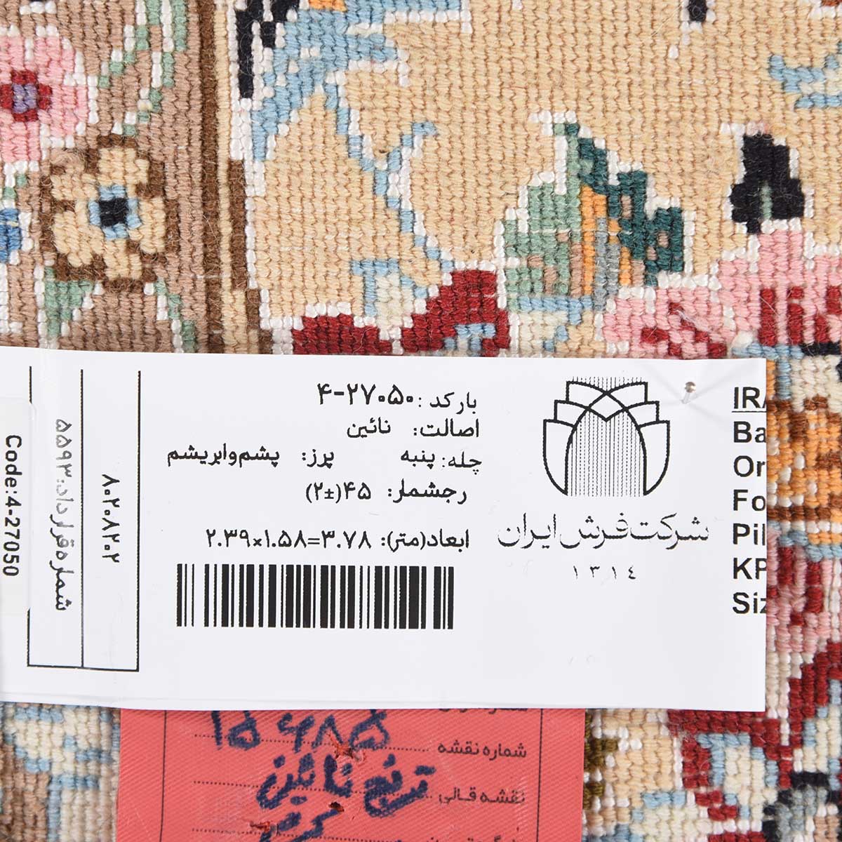 فرش دستباف نائین 45 رج قواره پرده ای کد: 4-27050